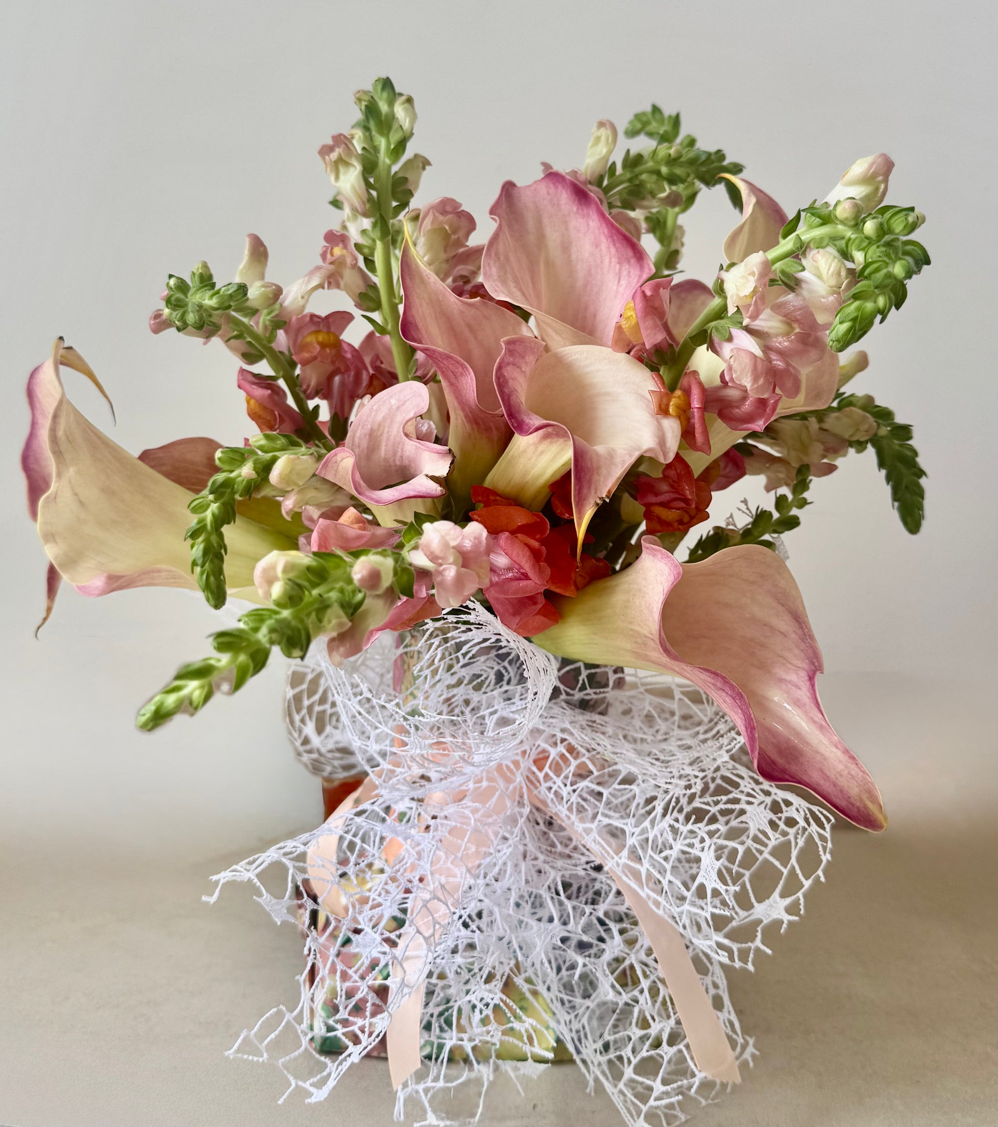 Este ramo artesanal de flores de temporada está compuesto por 2-3 tipos de flores frescas, seleccionadas según la estación del año para garantizar su belleza y frescura.